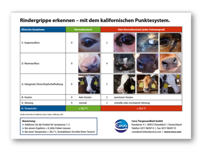 Das vom CEVA Blog für Rindergesundheit bereitgestellte Scoring bewertet sechs klinische Anzeichen. Für jedes Zeichen wird, sofern vorhanden, eine bestimmte Punktzahl vergeben. Eine Gesamtpunktzahl von 5 oder höher klassifiziert eine Tier als Rindergrippe-Fall.
